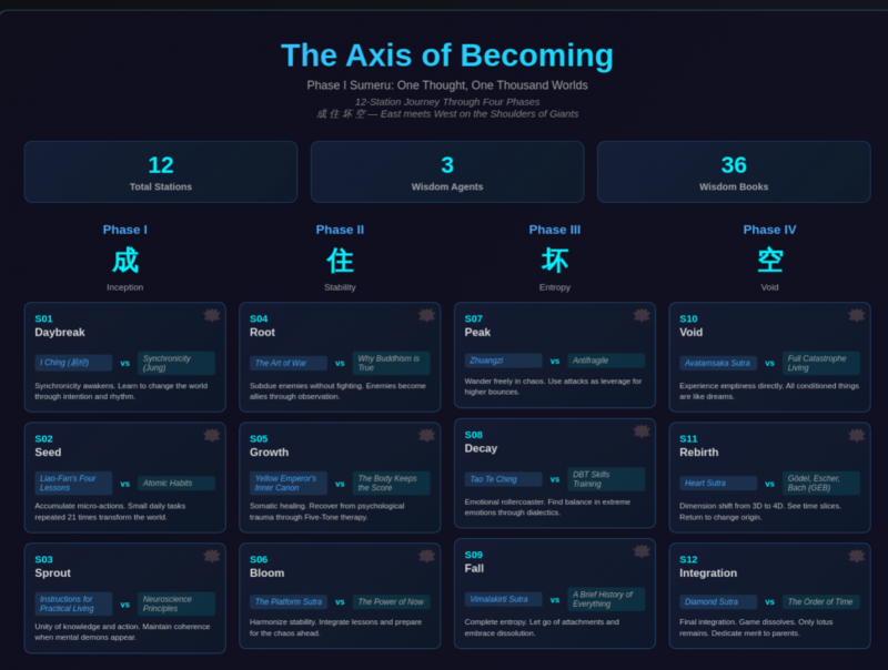 《成就之轴》(Axis of Becoming)的首个阶段——“须弥:一念三千”(Sumeru: One Thought, One Thousand Worlds),提出了一种不同于主流教育科技路径的构想。与传统以技能训练或语言教学为核心的数字学习产品不同,这一项目从设计之初就尝试将东方哲学中的关系思维、整体视角与审美经验,引入长期由西方理性主义与效率逻辑主导的数字教育体系之中。