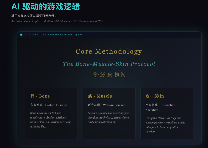 在团队看来,当人工智能重新塑造全球知识传播方式时,教育不仅是技术应用的问题,也逐渐成为文化表达与思想交流的重要空间。如何在技术迅速扩散的同时保留多元文化的理解方式,如何让不同文明的思维结构在数字环境中获得新的表达形式,成为这一项目试图回应的问题。正是在这一背景下,《成就之轴》提出了一种面向 AI 时代的“东学西渐”路径:让东方哲学不再只是文化文本中的知识对象,而是成为可以被体验、被互动、被感知的学习结构。